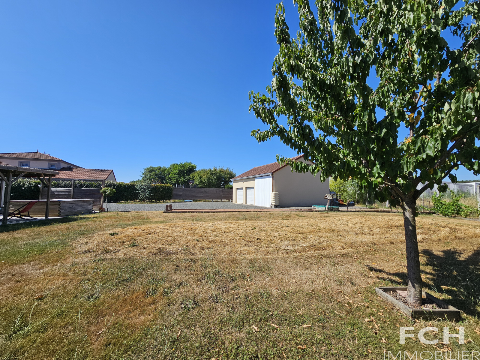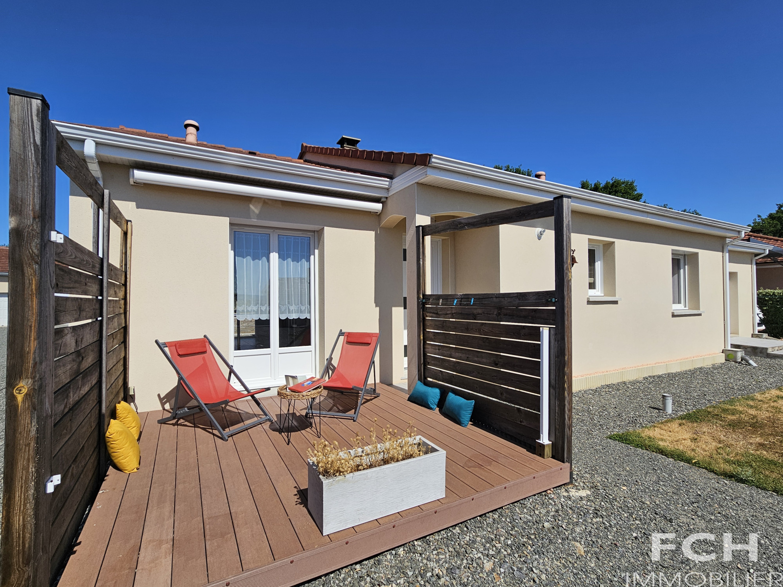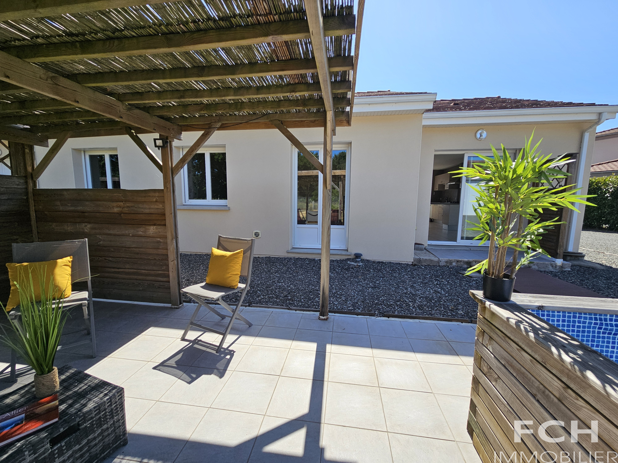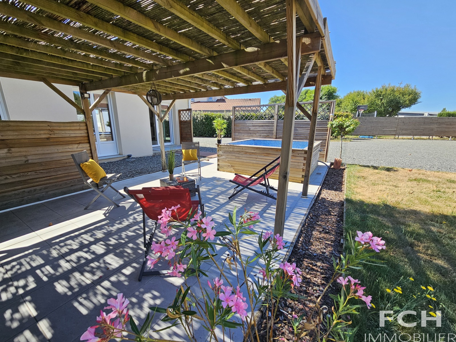 Les extérieurs sont très agréables avec une terrasse avant, une terrasse arrière avec pergola, un bassin pour se rafraîchir et un terrain de pétanque. Le tout sur un terrain plat d’environ 1600 m² avec portail automatique.