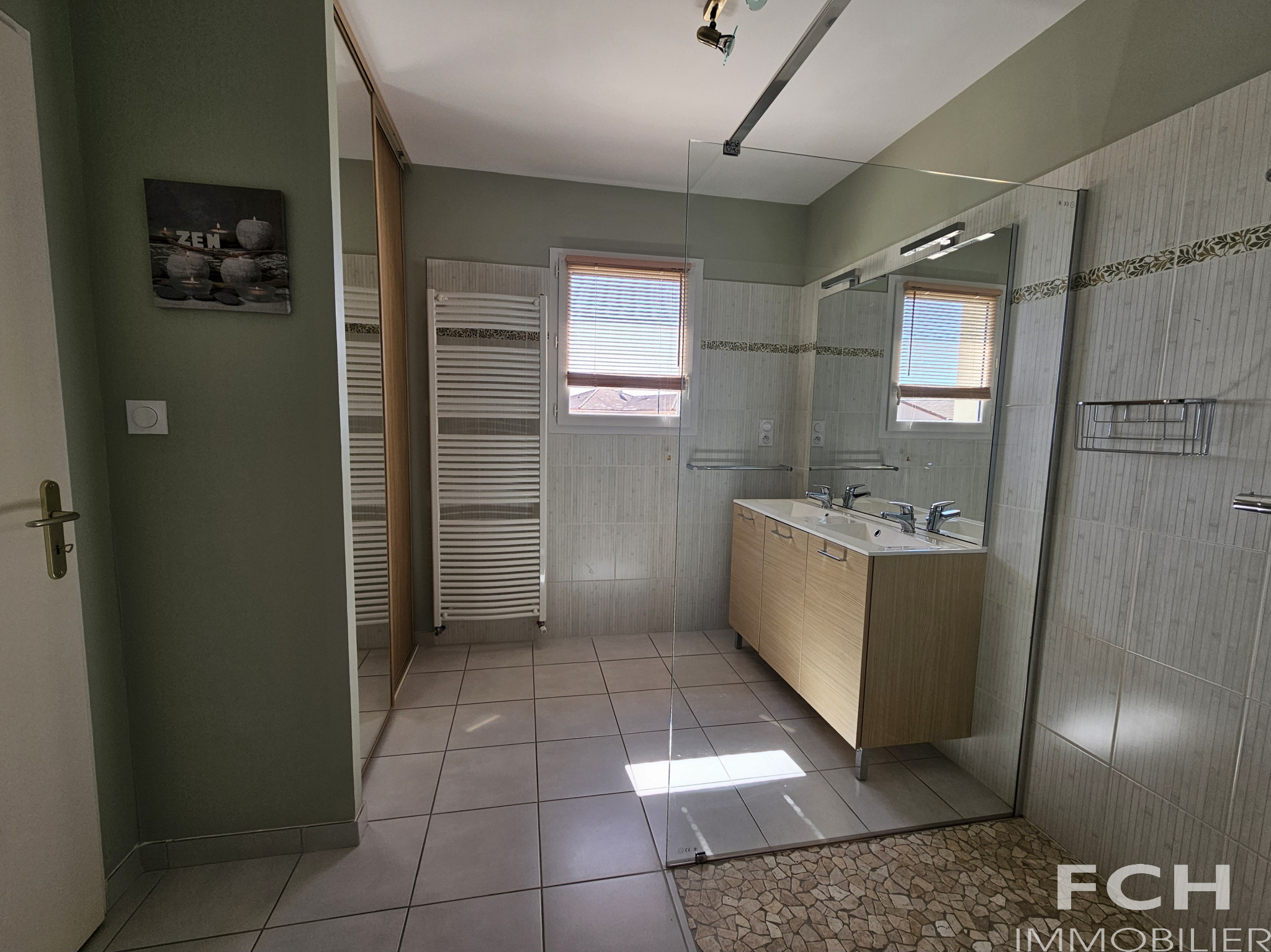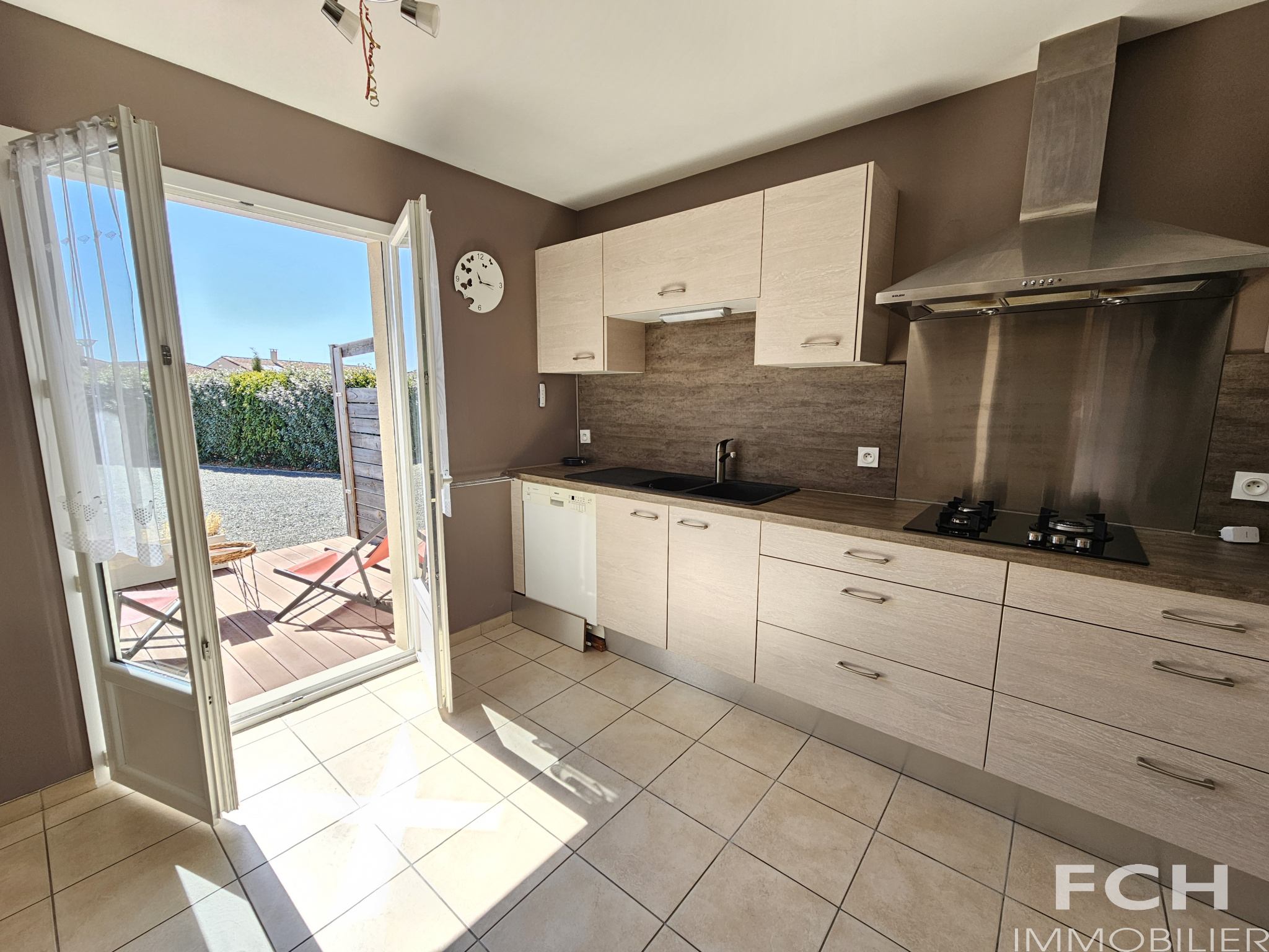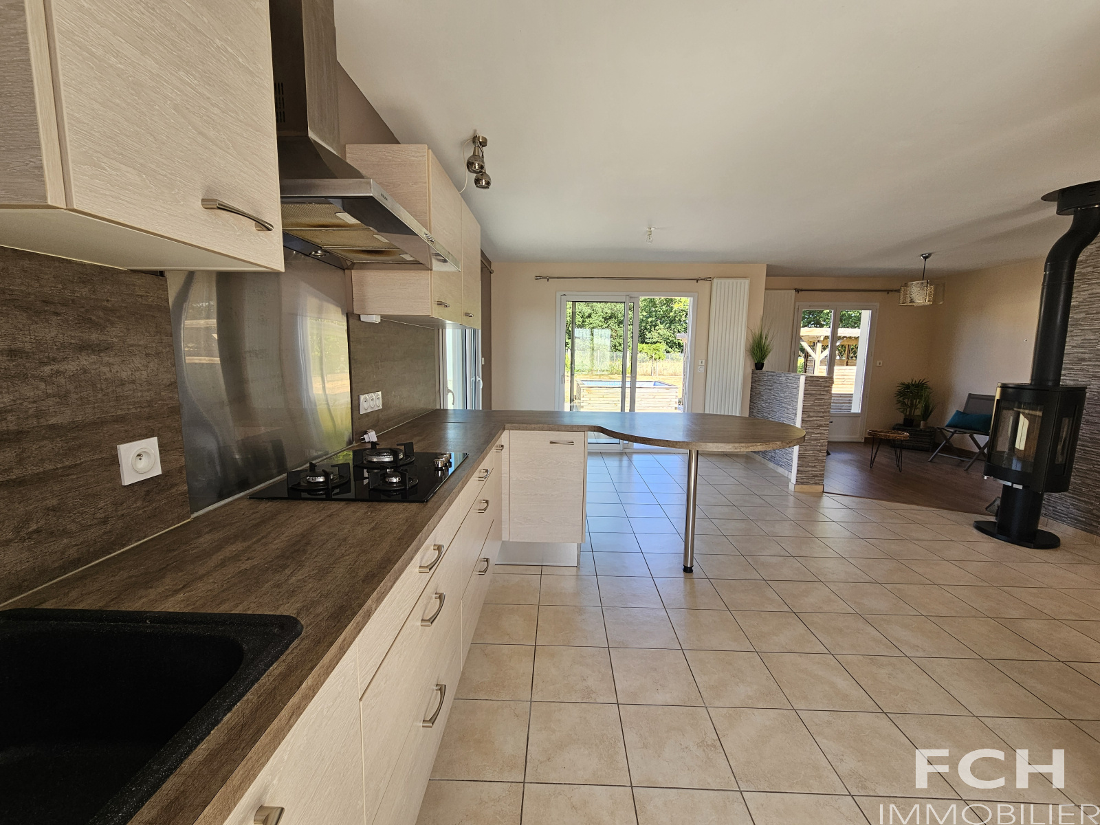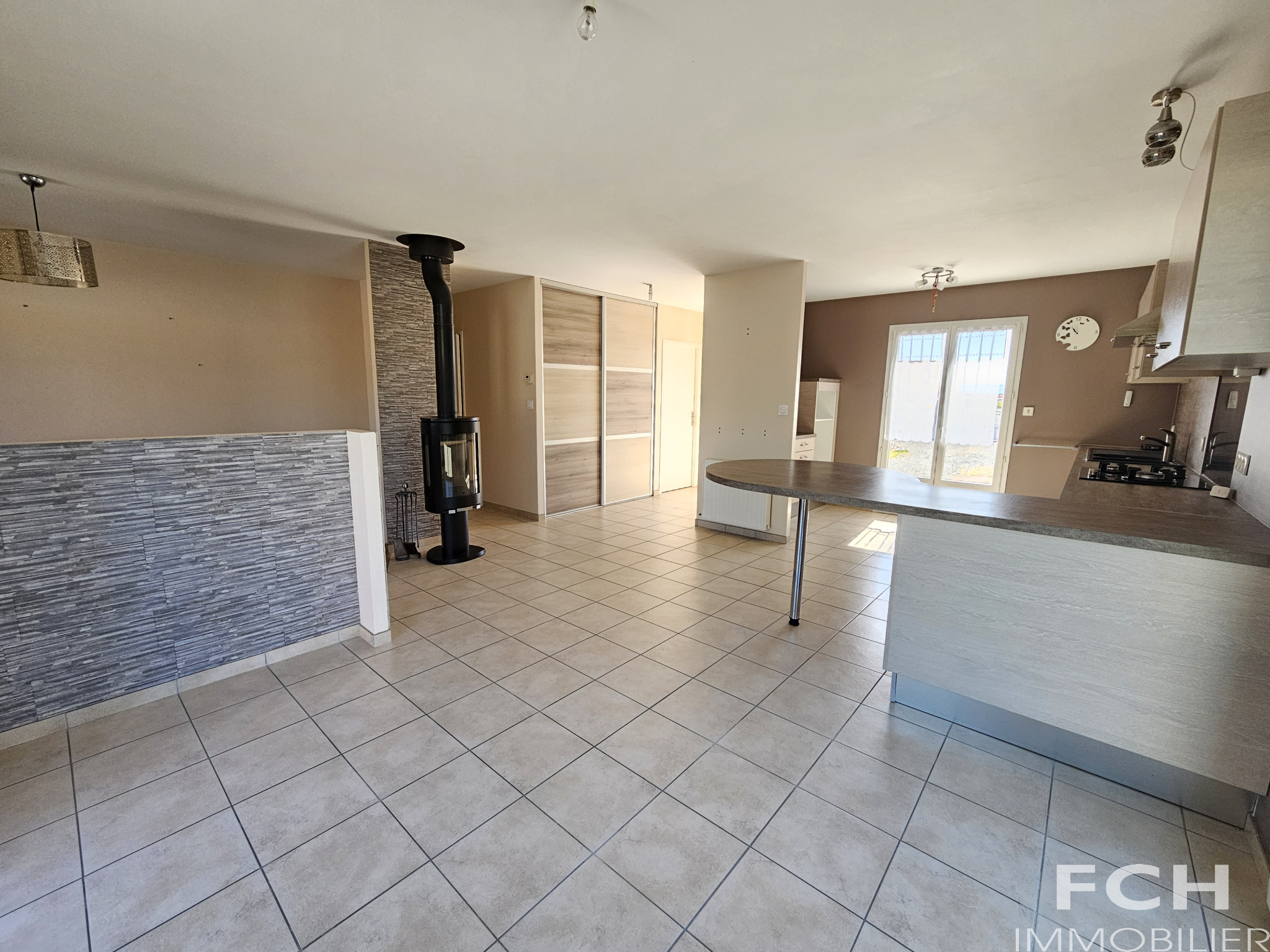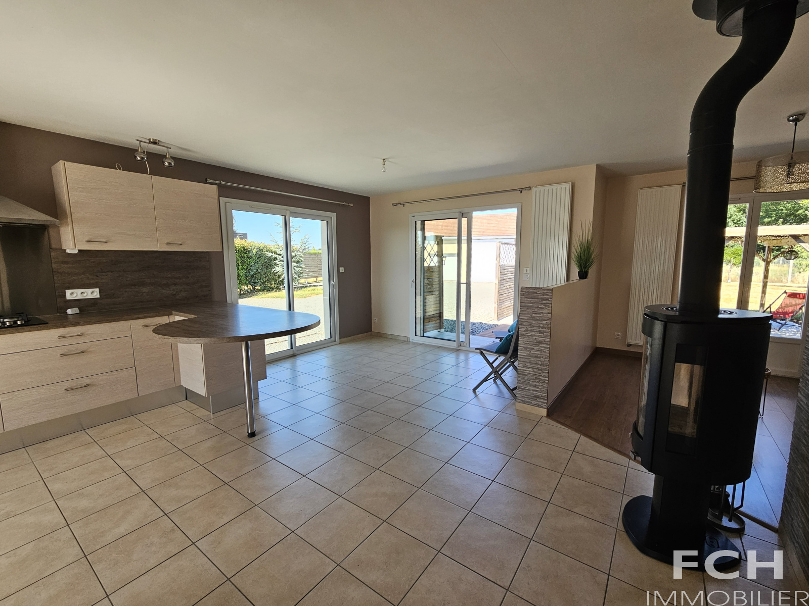 Prête à vous accueillir, cette maison aux normes RT2012 comprend : entrée avec grand placard-vestiaire, local chaudière gaz, pièce à vivre traversante de 40 m² avec accès terrasses comprenant cuisine équipée ouverte sur salle-à manger et partie salon (poêle à bois) ; dégagement desservant 3 chambres (9, 11 et 12 m²) avec placards, salle d’eau avec double vasques et placards, WC avec lave-mains, grande buanderie avec douche et dressing, cellier, et une pièce à usage de rangement et petit garage à vélos.