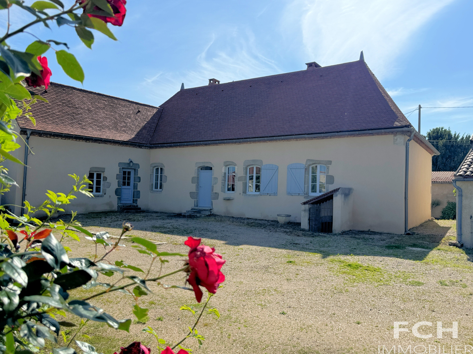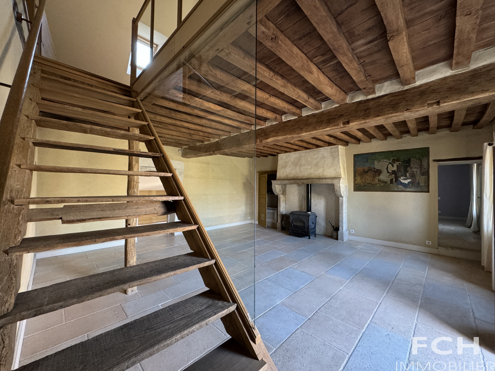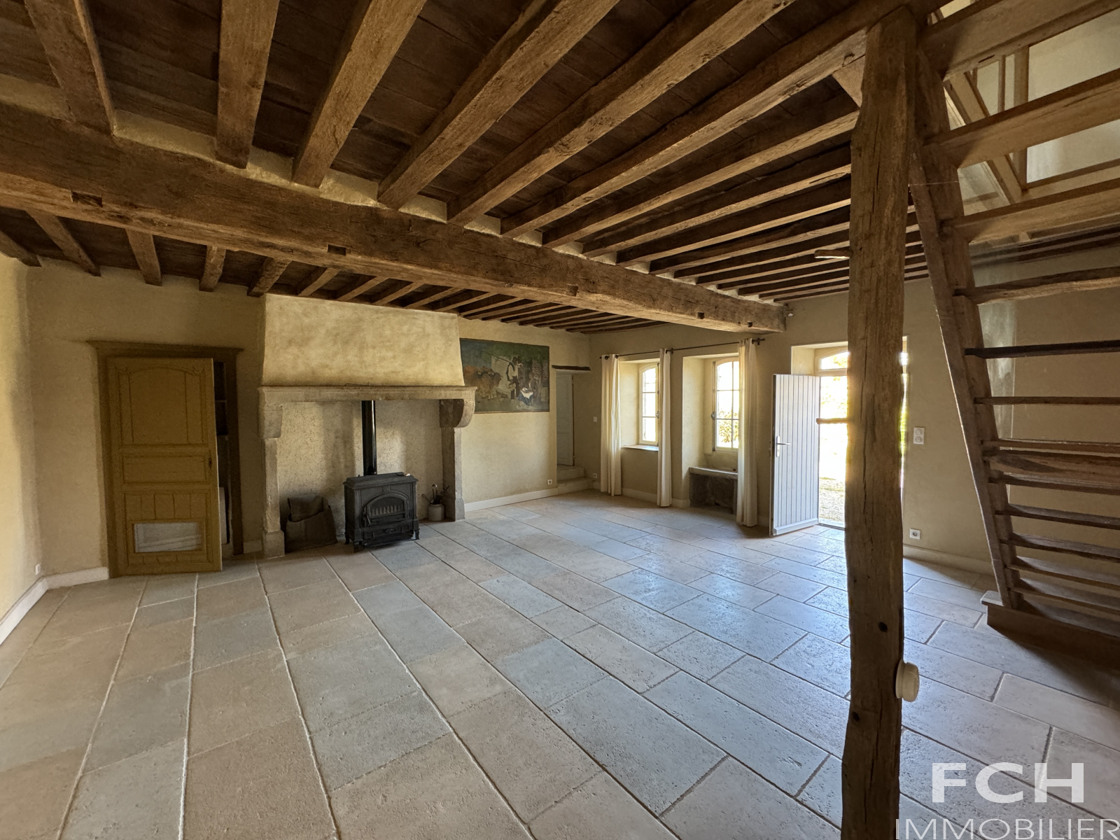 Un haut portail en fer motorisé ouvre sur une cour intérieure. A gauche, la maison principale de 1800, une belle longère de 200 m² habitables et rénovée avec gout, offre au rez-de-chaussée : spacieux salon de 42 m² avec poêle et belles poutres, salle à manger avec petit poêle à bois, cuisine équipée, cellier, chambre avec salle d'eau et WC, séjour donnant sur terrasse, WC et chaufferie. A l'étage : mezzanine de 34 m² et chambre ornée de magnifiques poutres, et salle de bains-WC .