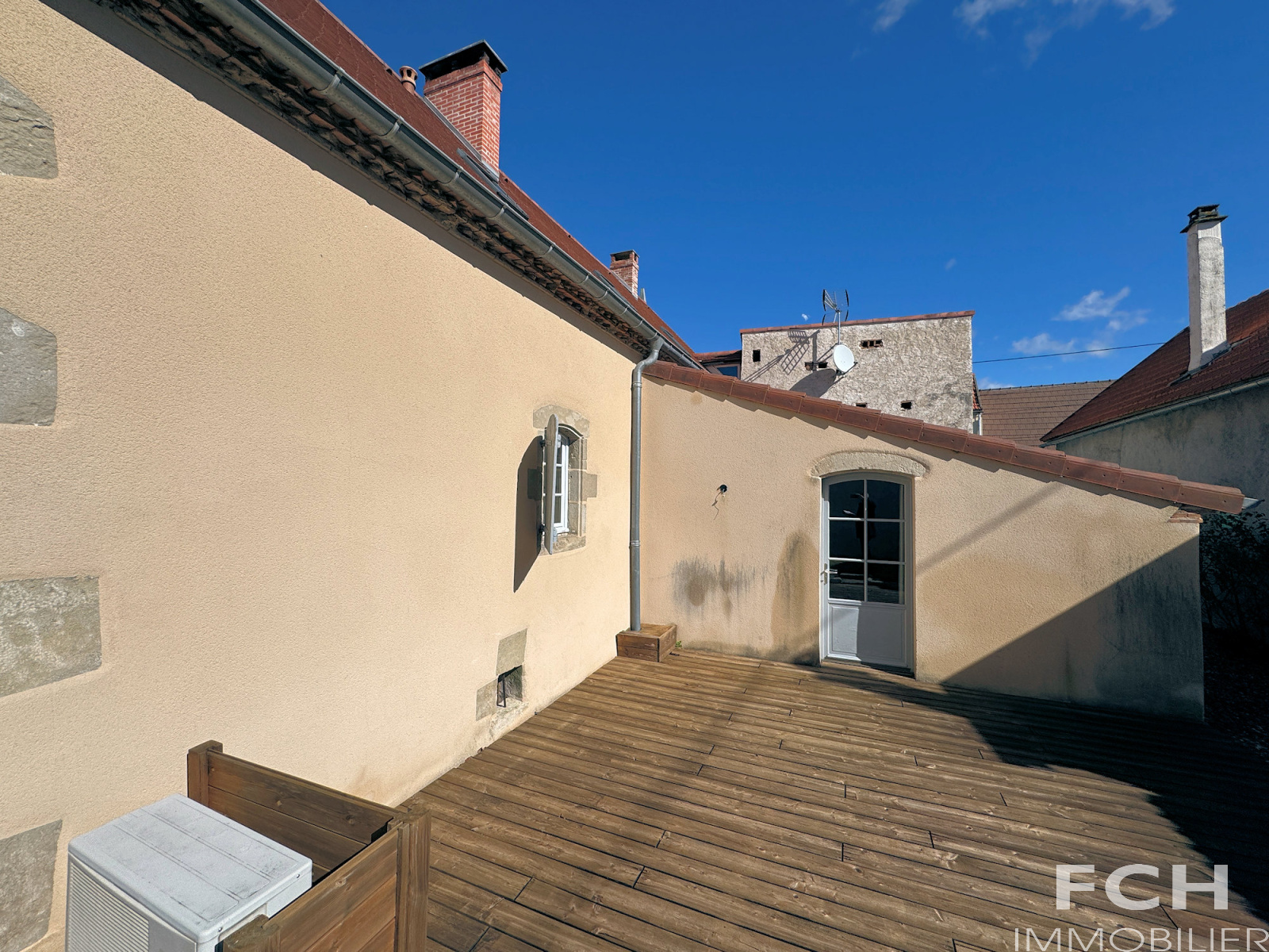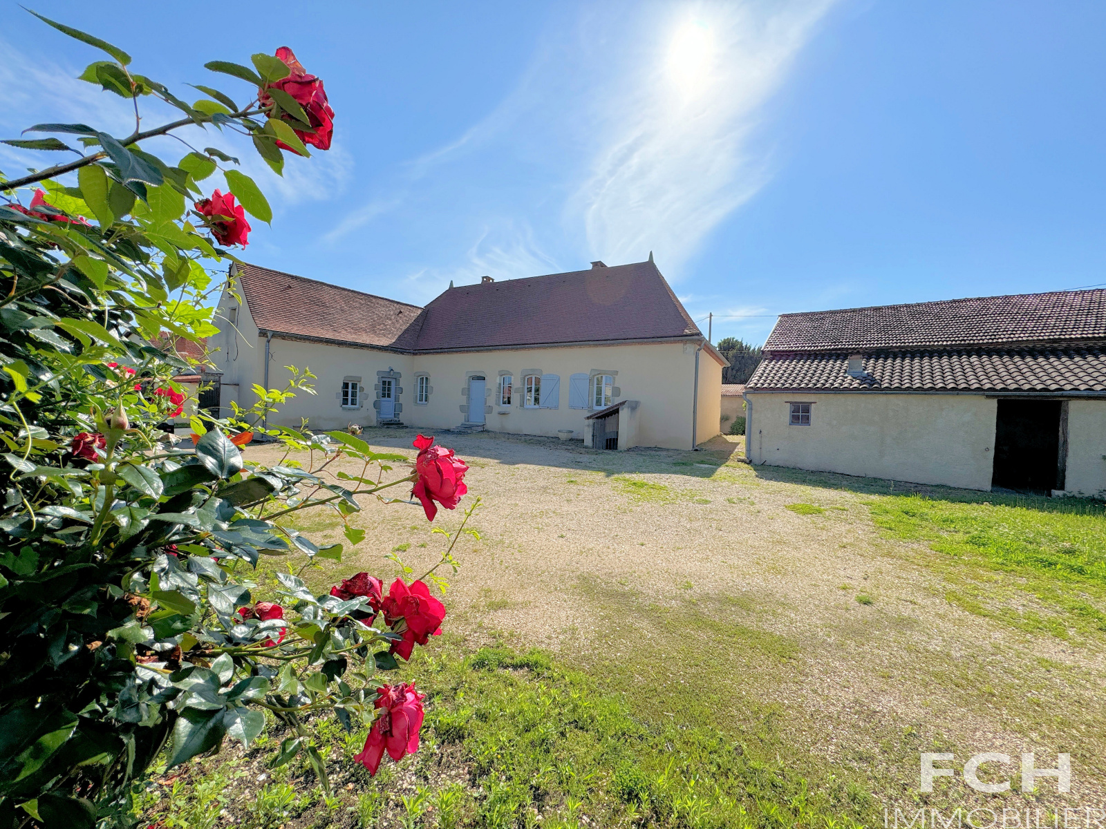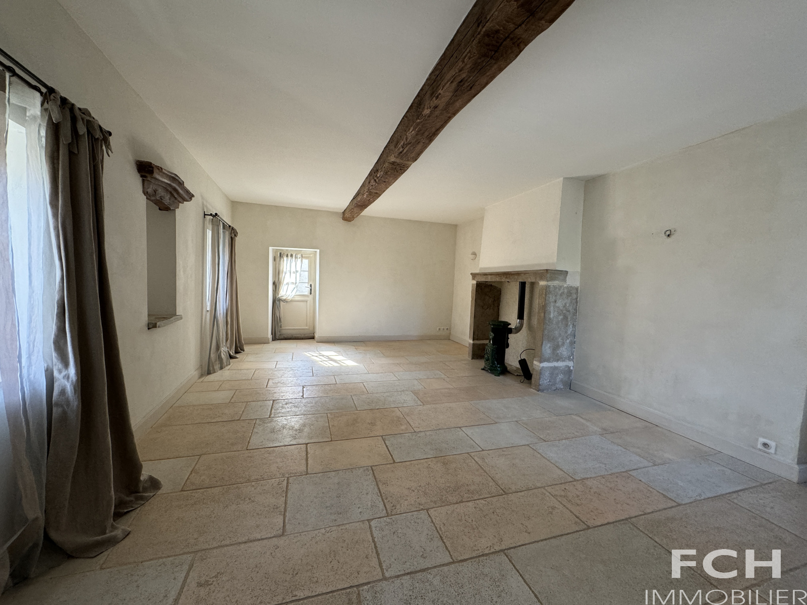 Un haut portail en fer motorisé ouvre sur une cour intérieure. A gauche, la maison principale de 1800, une belle longère de 200 m² habitables et rénovée avec gout, offre au rez-de-chaussée : spacieux salon de 42 m² avec poêle et belles poutres, salle à manger avec petit poêle à bois, cuisine équipée, cellier, chambre avec salle d'eau et WC, séjour donnant sur terrasse, WC et chaufferie. A l'étage : mezzanine de 34 m² et chambre ornée de magnifiques poutres, et salle de bains-WC .