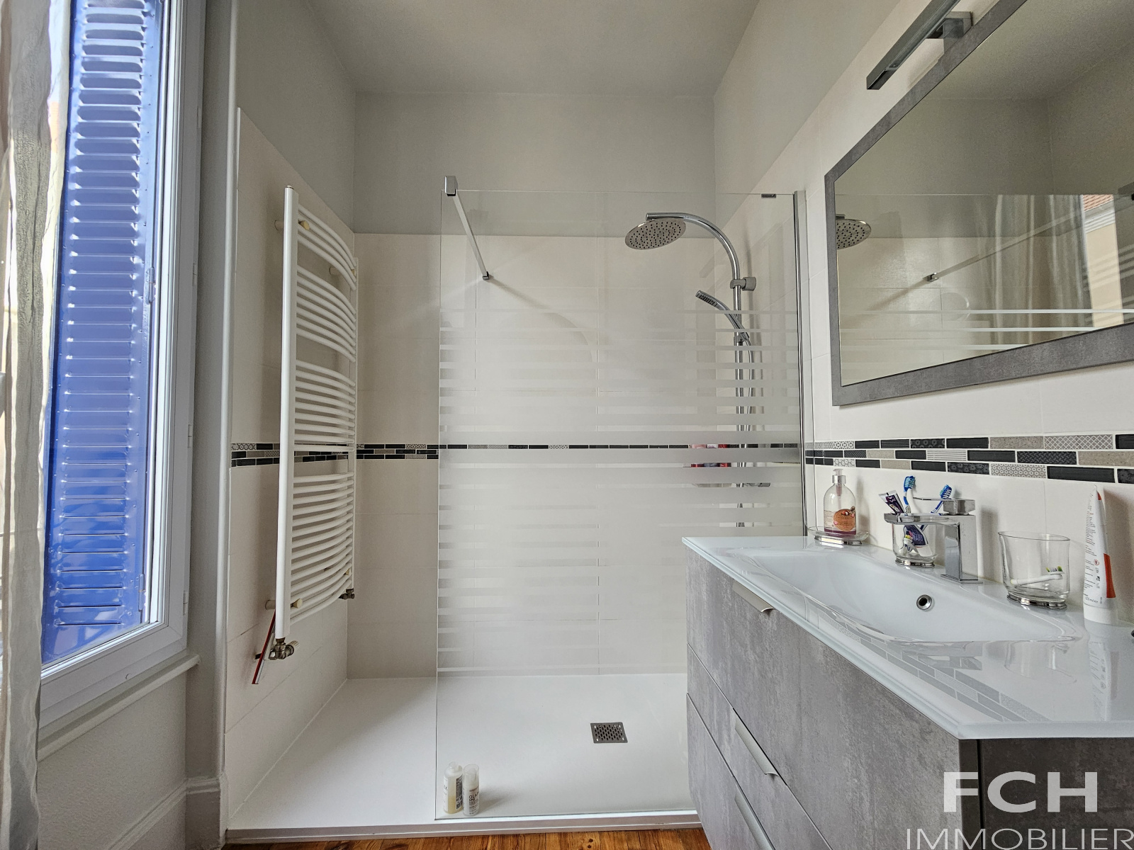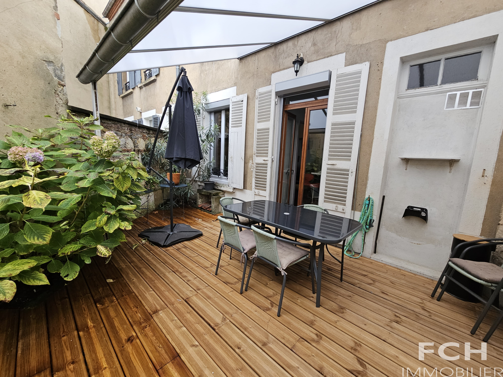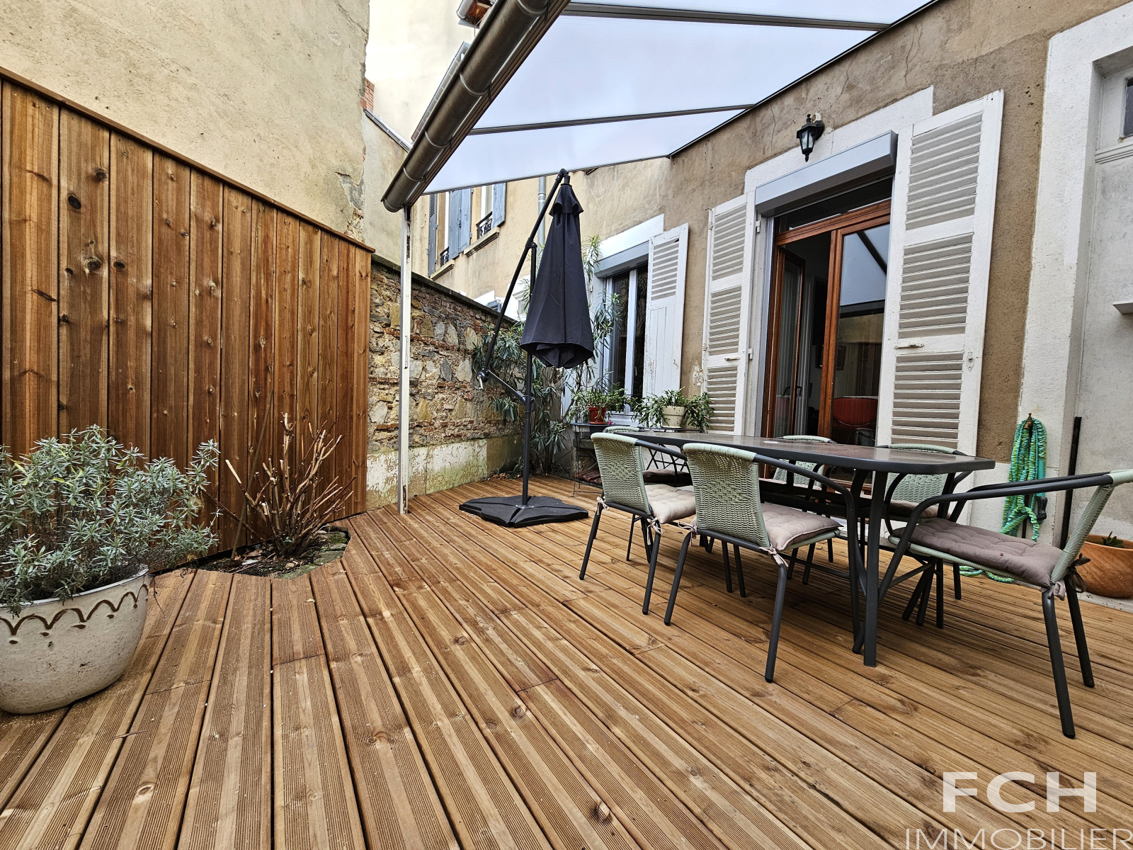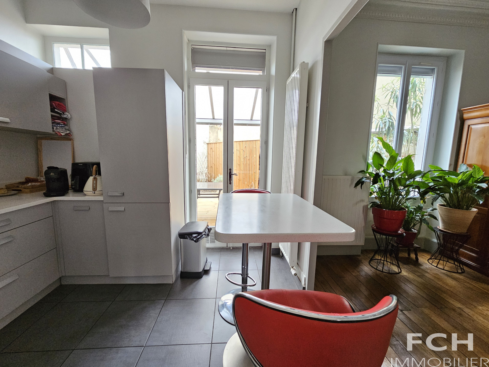 Au rez-de-chaussée, hall d’entrée avec carreaux de ciment d’époque, placard et WC, séjour double traversant, cuisine récente semi-ouverte entièrement équipée avec accès sur une cour avec une belle terrasse en bois où vous pourrez profiter d’un agréable espace repas/détente à la belle saison.