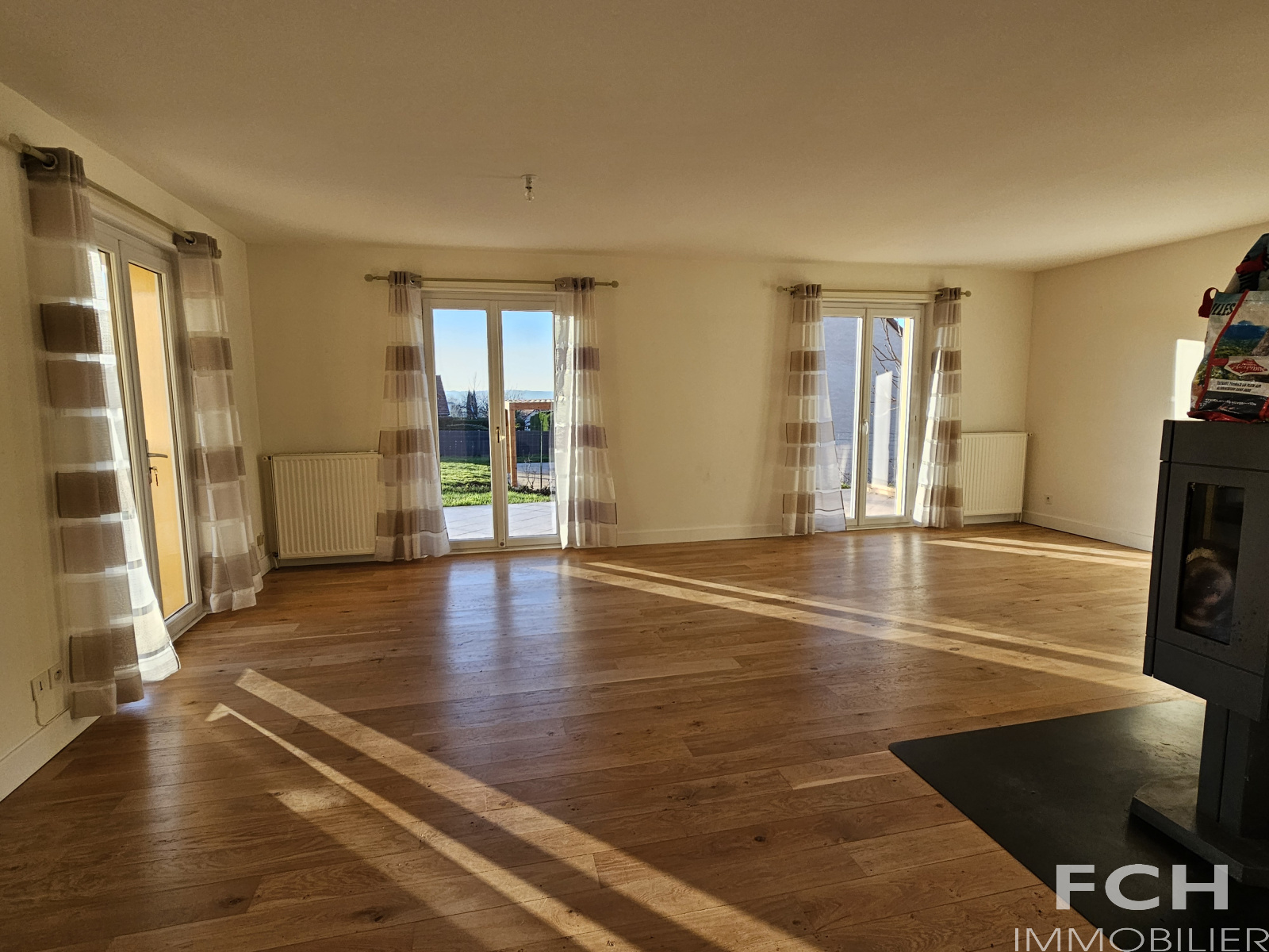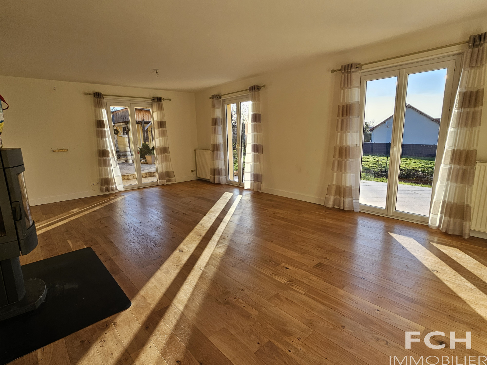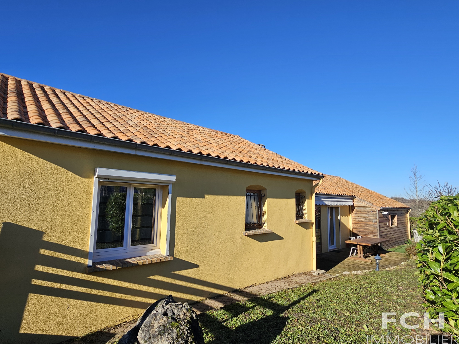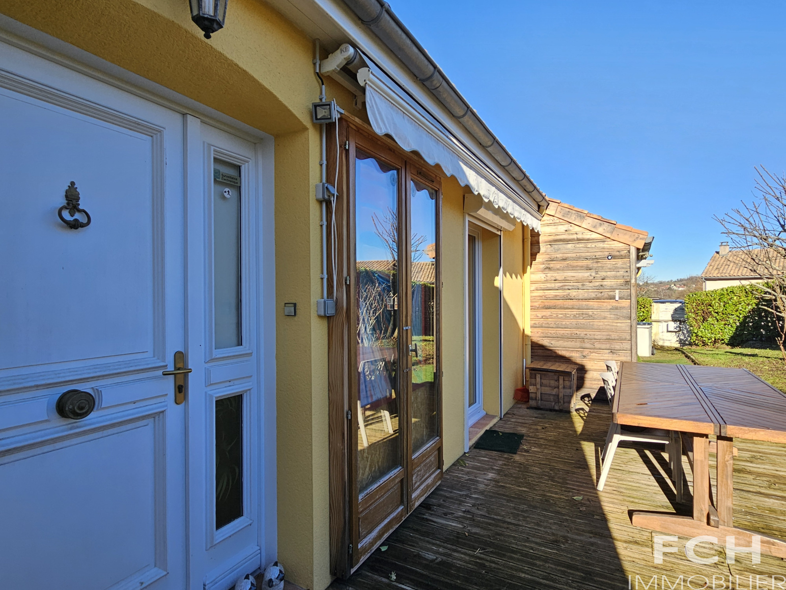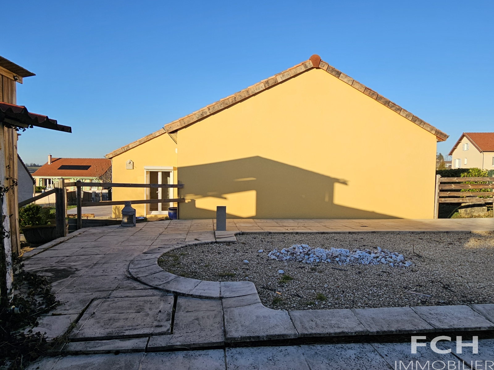 VENDU - Sur les hauteurs de Creuzier-le-Vieux, dans un quartier résidentiel calme avec vue dégagée, découvrez en EXCLUSIVITE cette agréable maison de plain-pied prête à vous accueillir. Exposée est-ouest, elle comprend : entrée avec vestiaire, séjour-salle à manger lumineux de 37 m² avec poêle à bois et sortie en terrasse, cuisine SCHMIDT avec accès à une deuxième terrasse. Un couloir (2 marches) dessert trois chambres, salle de bains, WC séparé avec lave-mains. Buanderie, cellier. Une pièce de 25 m² (bureau/salle de jeux...) peut aisément redevenir le garage double d'origine si besoin (sa surface n'est pas comprise dans les 110 m² habitables annoncés). Pièce de rangement dans les combles. Terrain clos de 753 m² avec abris jardin. Excellent DPE (C) : double vitrage 2015, chaudière VIESSMANN 2021, poêle à bois, isolation toiture récente.